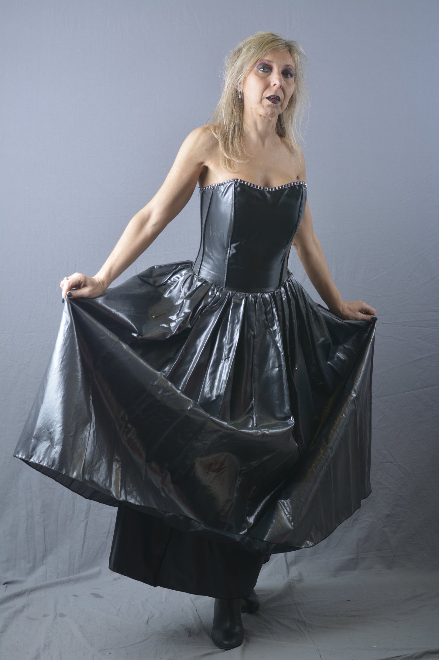 Eleganza e comfort si uniscono in questo abito lungo realizzato in taffettà color acciaio. Il corpino a bustier con stecche morbide offre un sostegno perfetto e una vestibilità impeccabile. Rifinito con passamaneria argento e nera, questo abito è un capolavoro di stile e raffinatezza. La chiusura stringata sul retro permette di adattare facilmente la vestibilità, rendendolo ideale per ogni occasione speciale.
