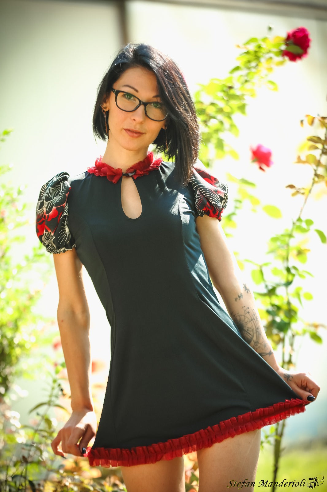 Miniabito in Viscosa Leggera con Maniche a Palloncino e Dettagli in Organza Rossa