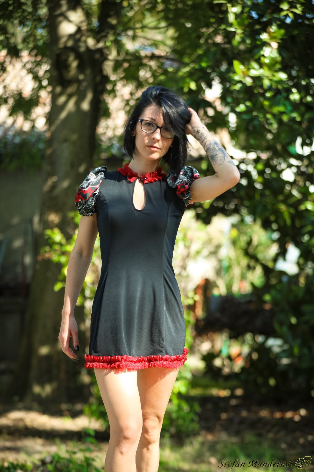 Scopri il fascino del miniabito in viscosa leggera nera, impreziosito da maniche a palloncino con una vivace fantasia. I bordi in rouche di organza rossa aggiungono un tocco di eleganza e colore, mentre lo scollo a occhiello con chiusura a bottone garantisce una vestibilità raffinata e comoda. Con una lunghezza di 75 cm, questo miniabito è perfetto per un look audace e sofisticato che non passa inosservato.