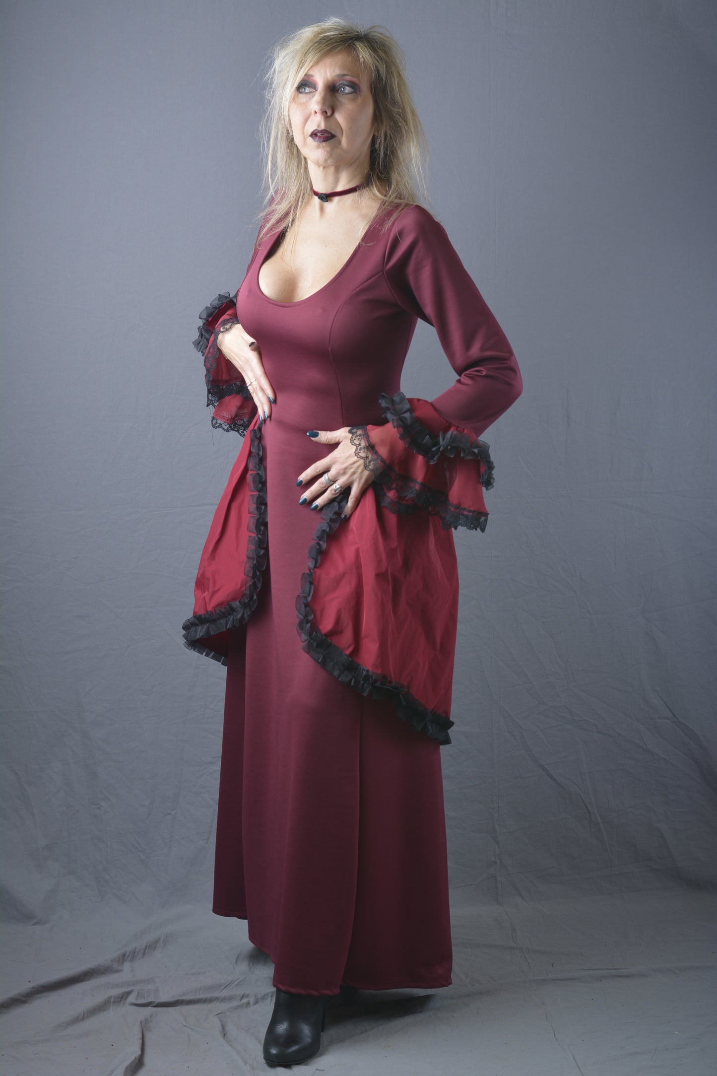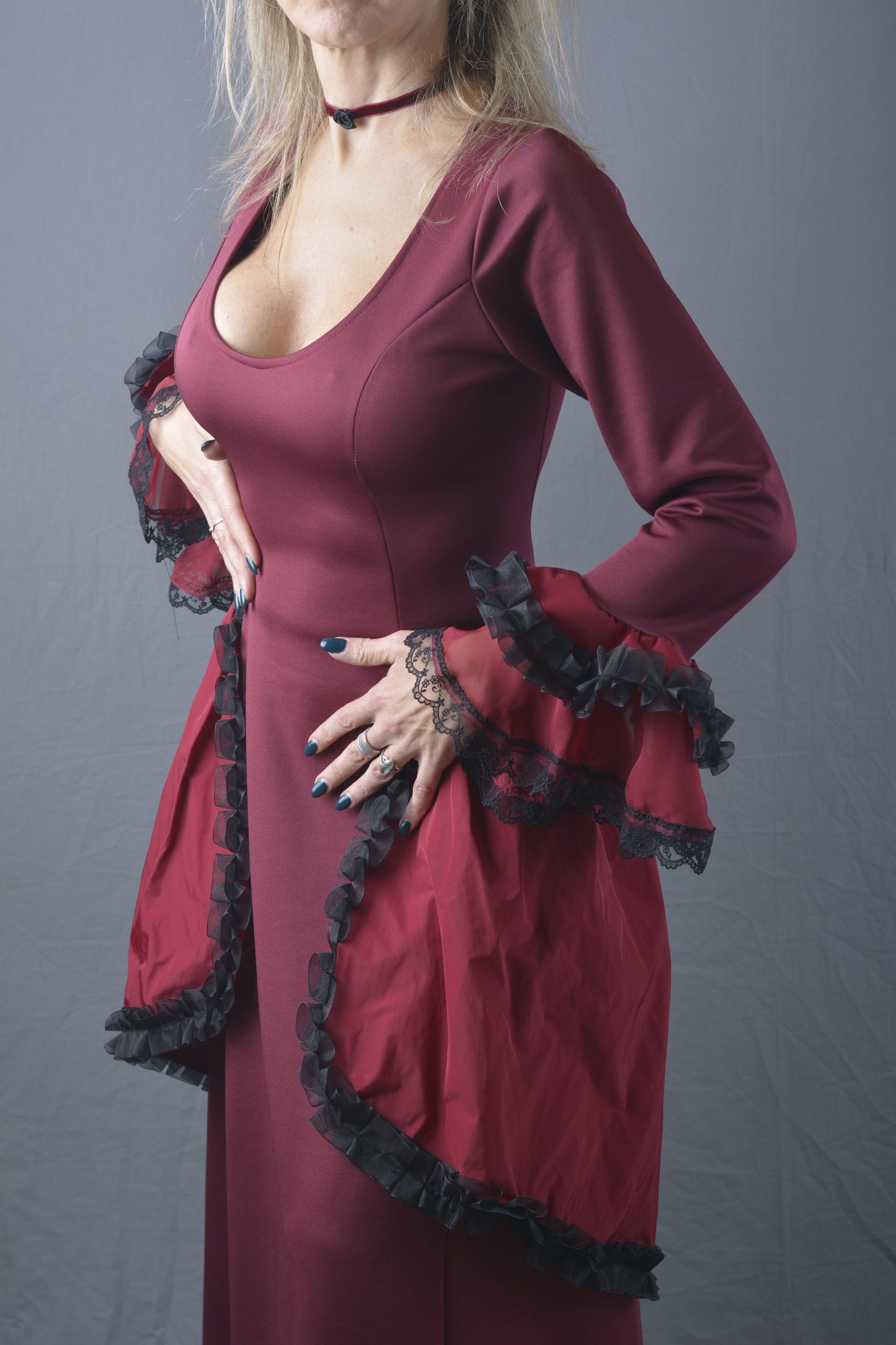Abito Lungo Bordeaux con Sopragonna e Volant in Taffettà
