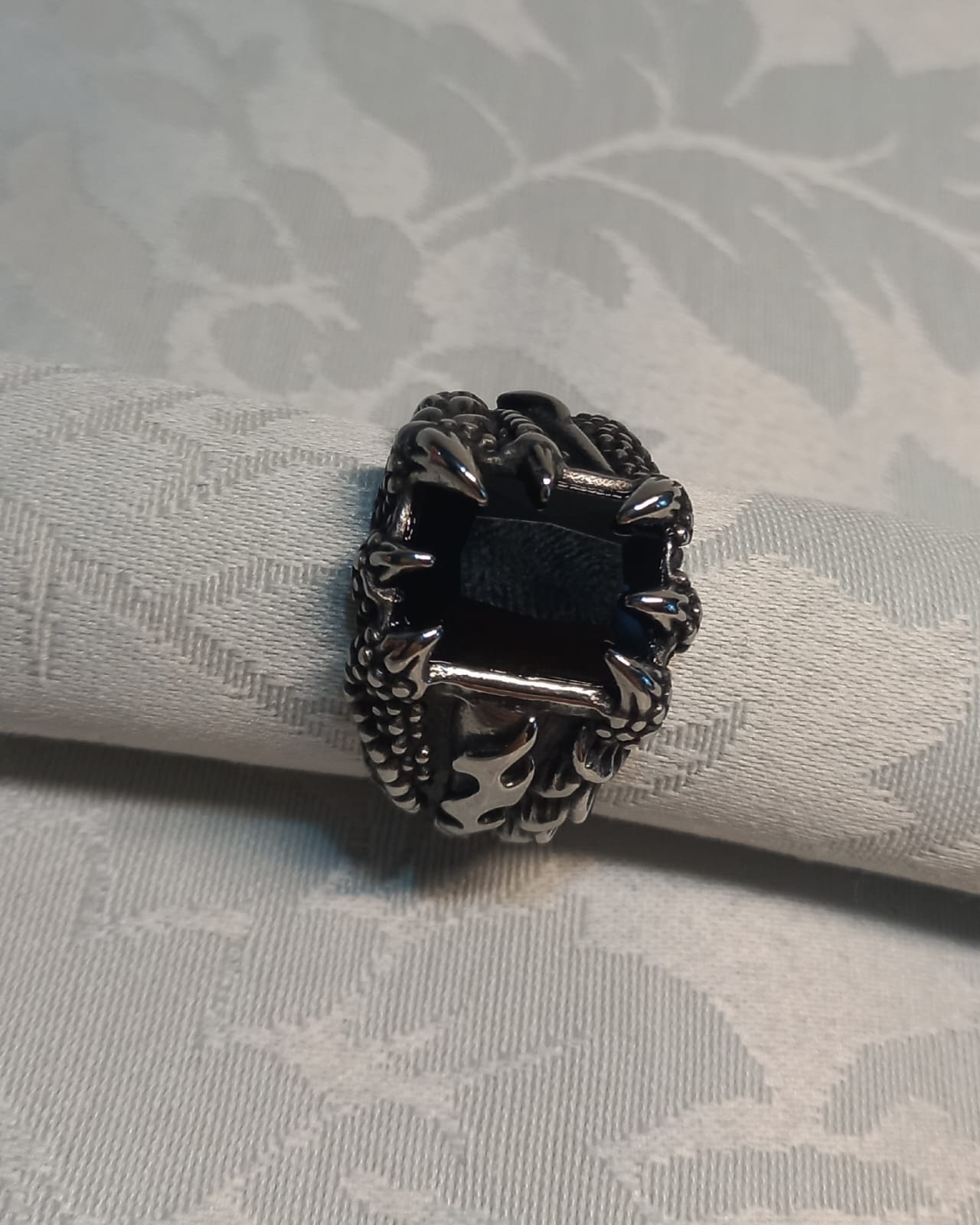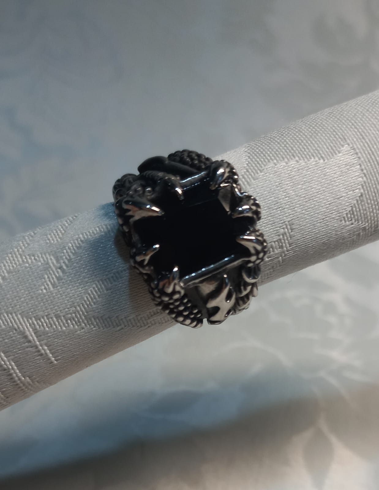 Anello in Acciaio con Cristallo Nero e Artigli di Drago