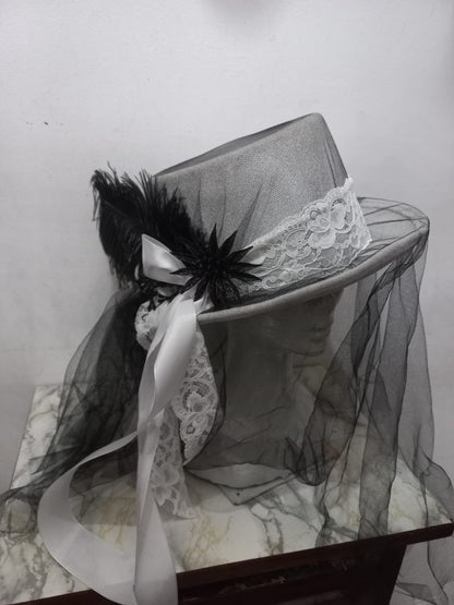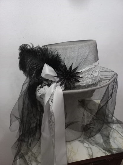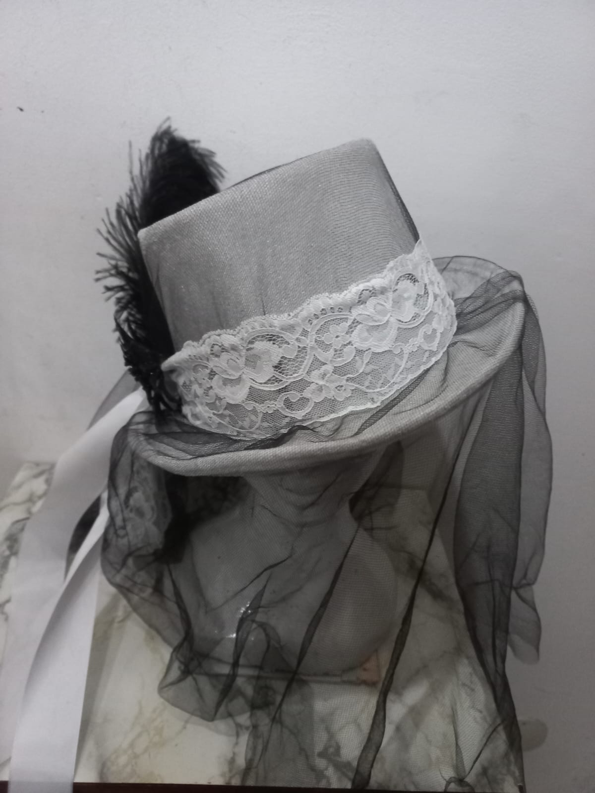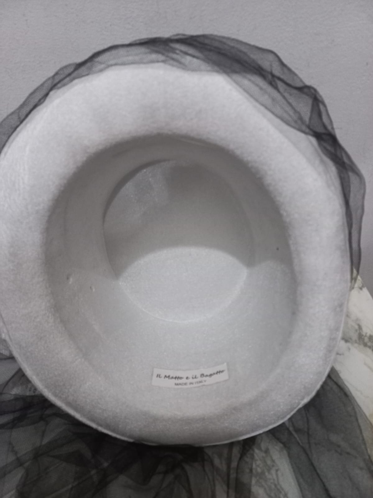 Aggiungi un tocco di raffinatezza al tuo stile con questo cilindro in vellutino poliestere, arricchito con tulle nero e decorato con pizzo e nastro in raso. Questo accessorio unico è impreziosito da un fiore e una piuma di struzzo, rendendolo perfetto per ogni occasione speciale. Con una circonferenza di 59 cm, questo cilindro sfoderato è ideale per chi desidera un look elegante e sofisticato.