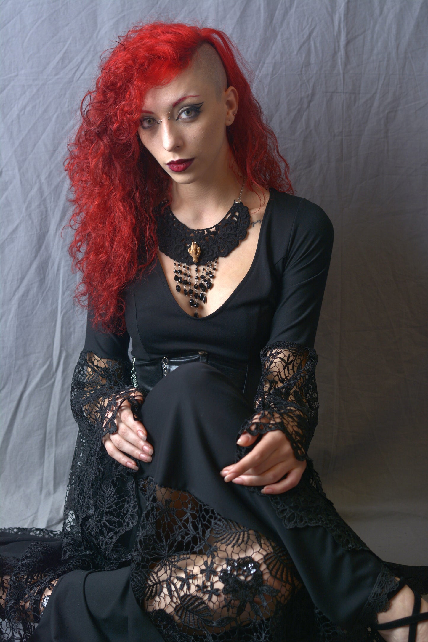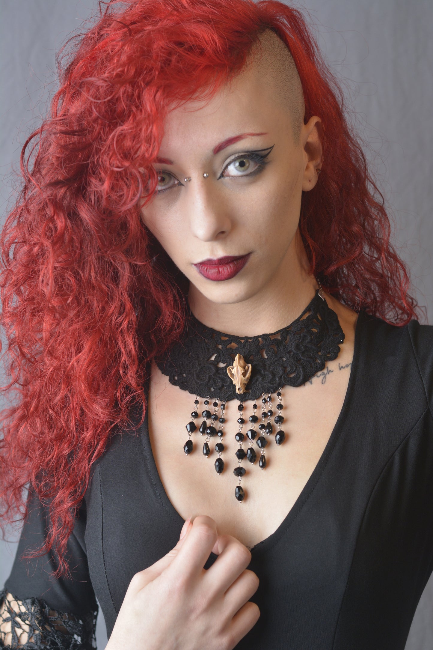 Esprimi la tua personalità unica con il nostro collier in pizzo decorato con un intrigante teschio canino e pendenti di cristalli neri. Questo accessorio distintivo è perfetto per aggiungere un tocco di mistero e fascino gotico al tuo look. La chiusura regolabile garantisce una vestibilità comoda e sicura, adattandosi perfettamente al tuo collo. Ideale per completare sia outfit eleganti che casual, questo collier sarà il tuo compagno di stile per ogni occasione.