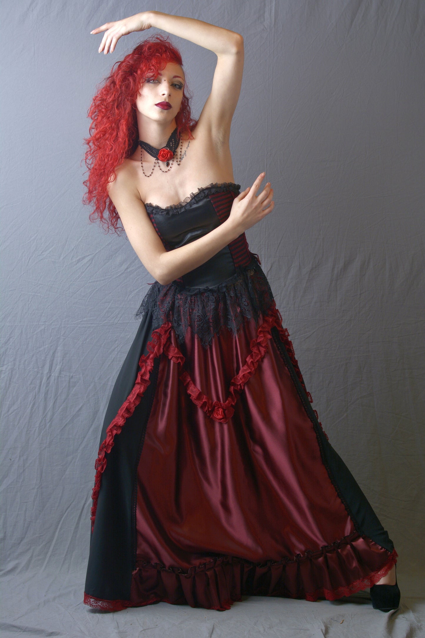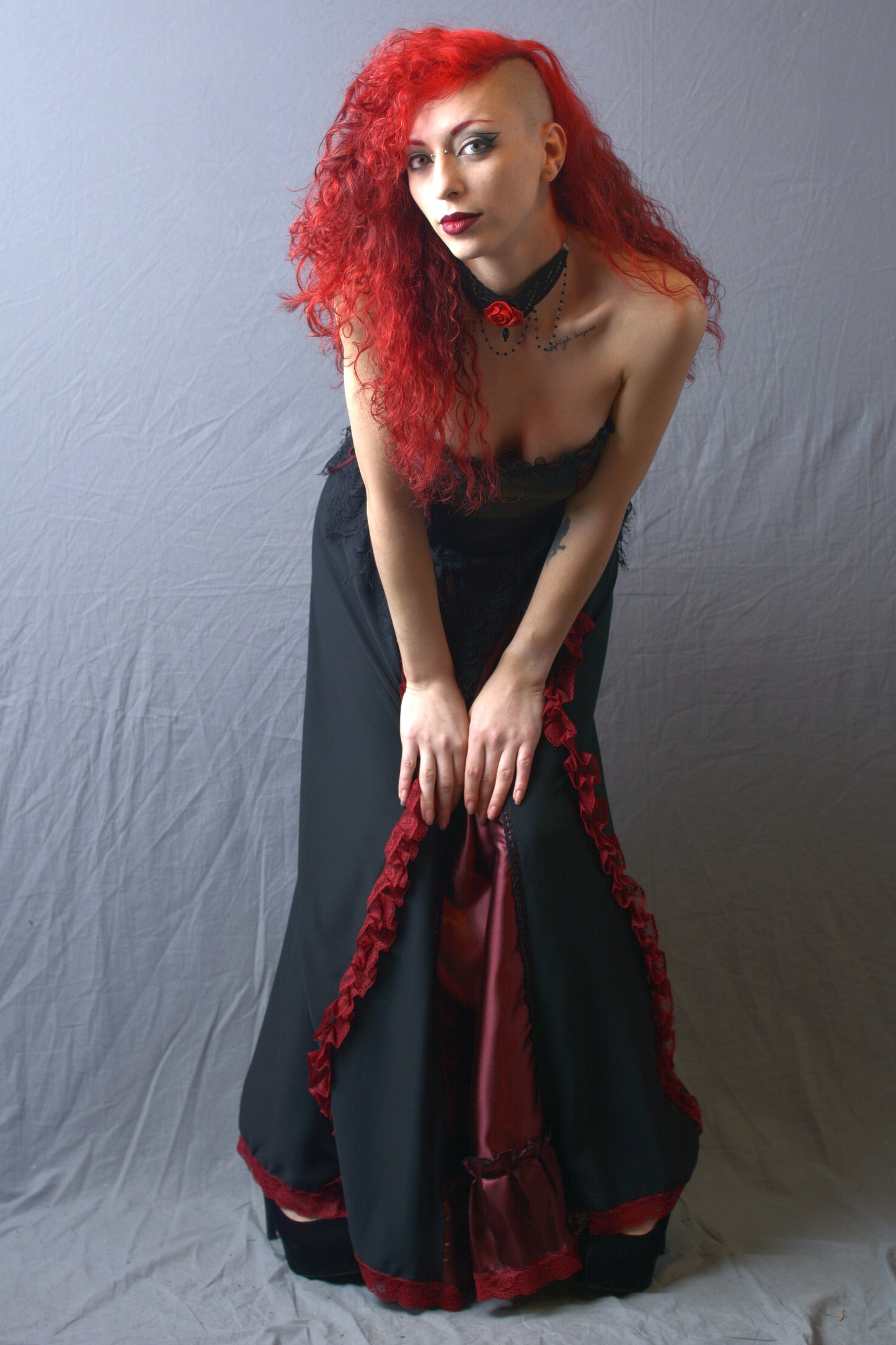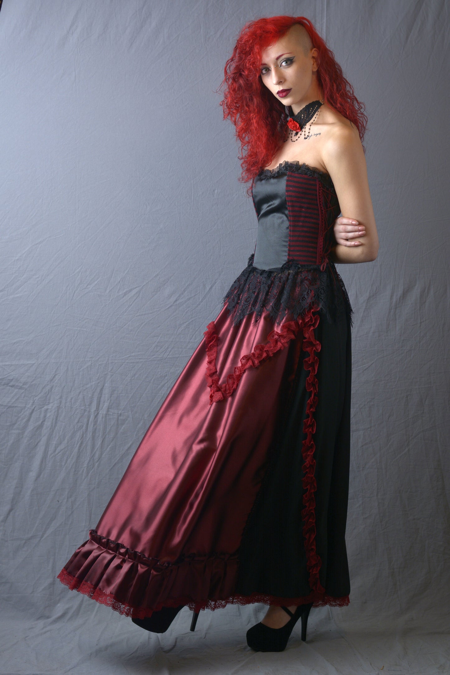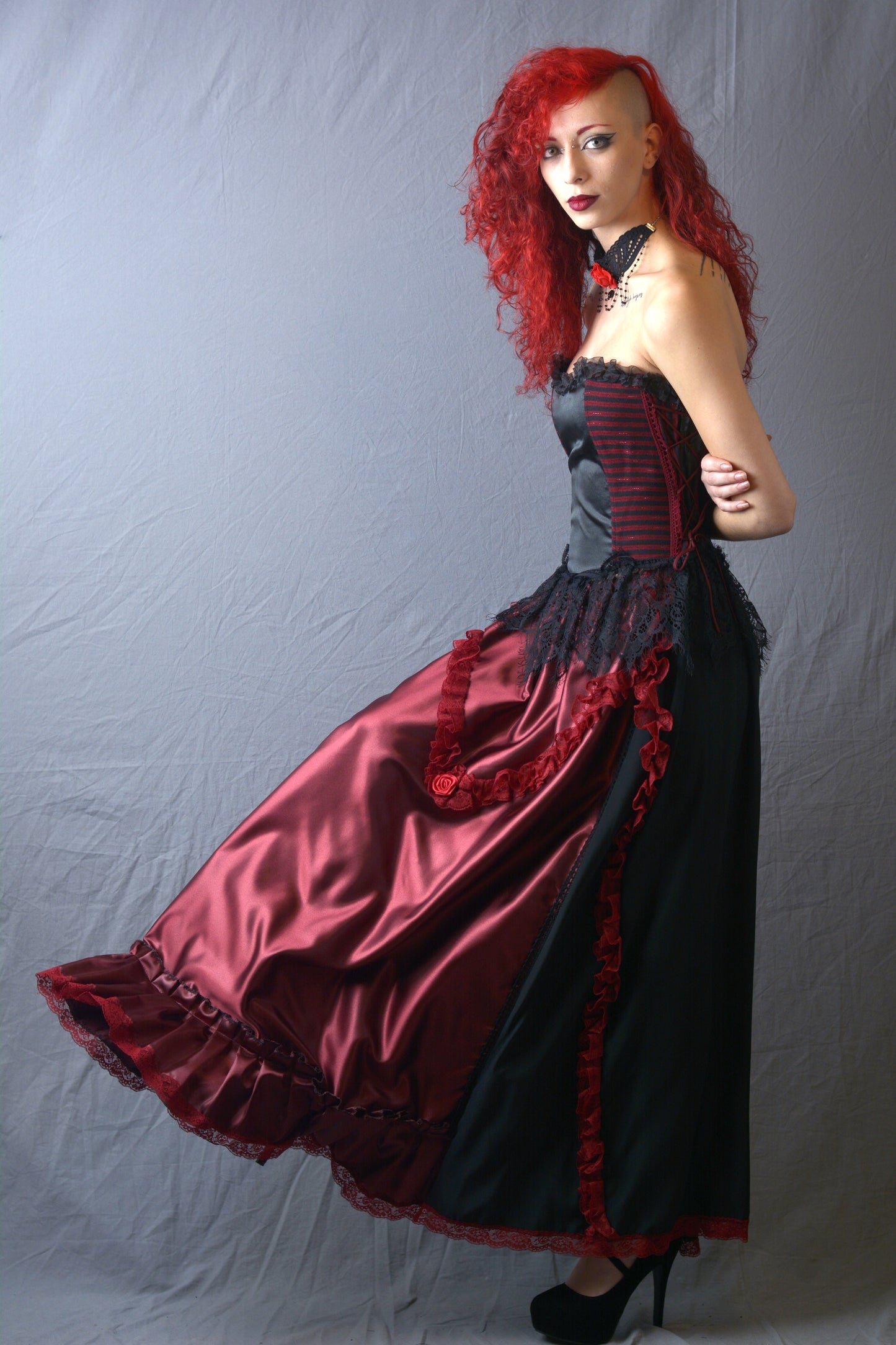 Gonna Lunga in Raso Bordeaux e Nero con Rouches di Pizzo