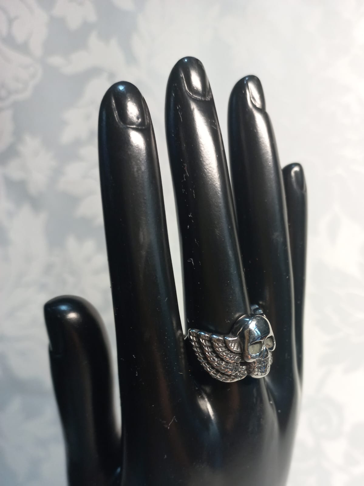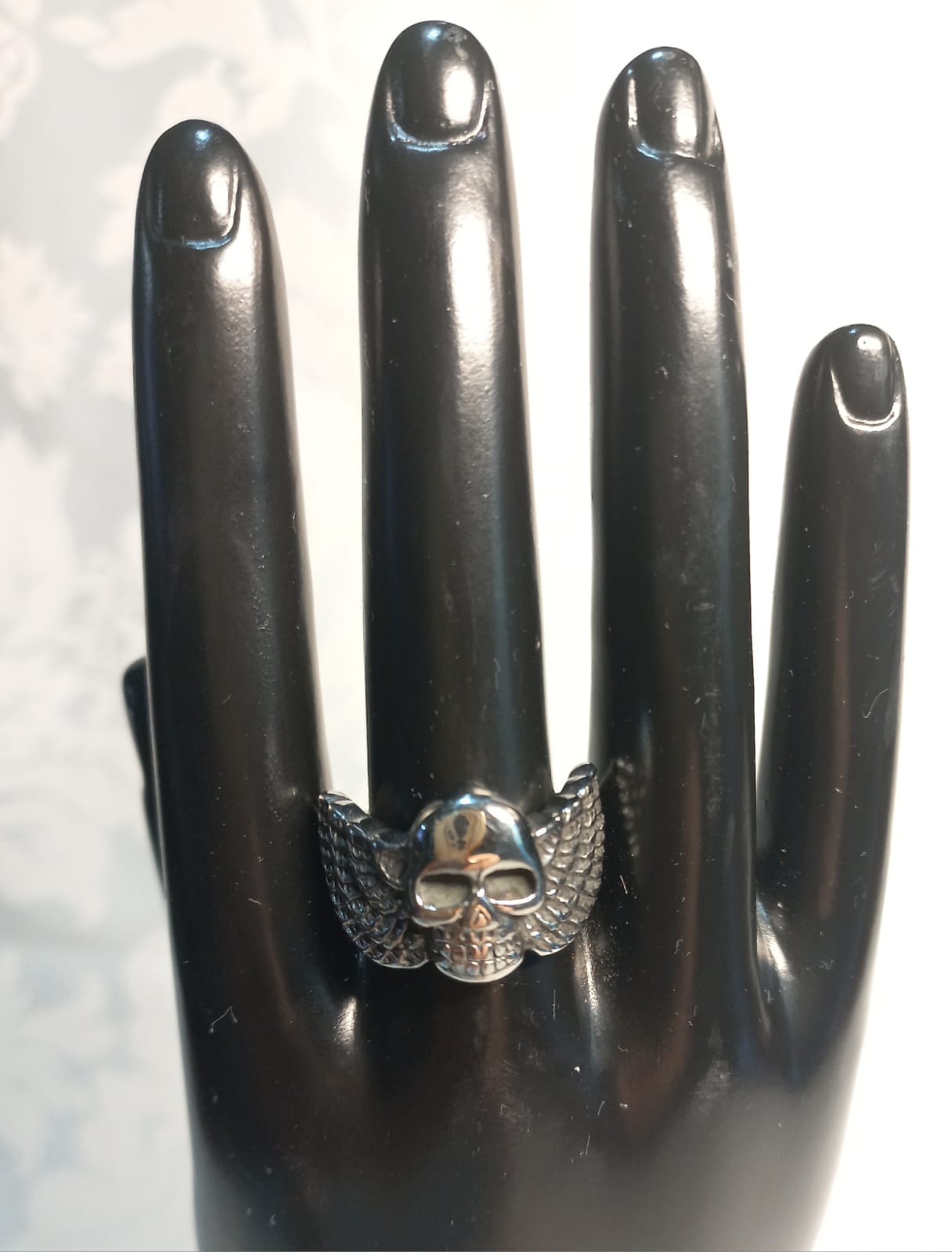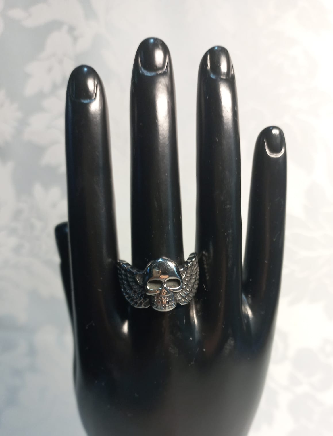 Aggiungi un tocco di mistero e potenza al tuo stile con questo anello in acciaio, caratterizzato da un teschio alato. La lavorazione dettagliata e la qualità dei materiali rendono questo anello un accessorio distintivo e di carattere. Perfetto per chi desidera esprimere la propria personalità con un gioiello che racconta una storia di forza e libertà.