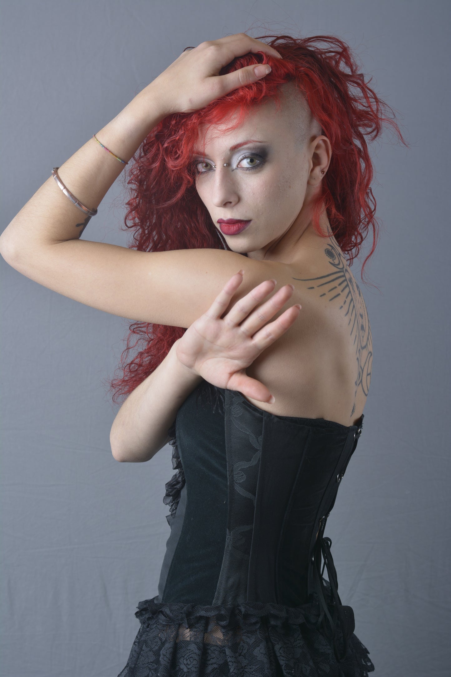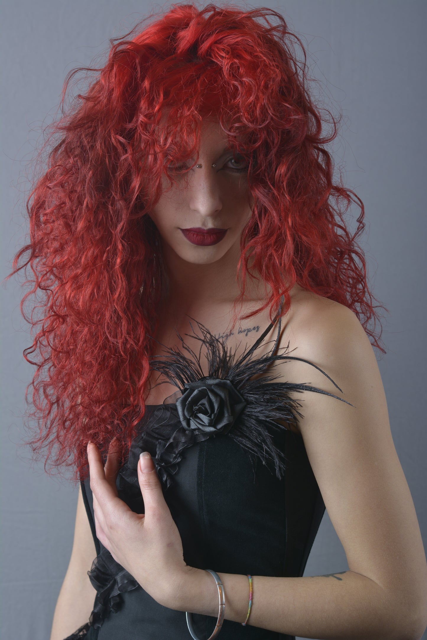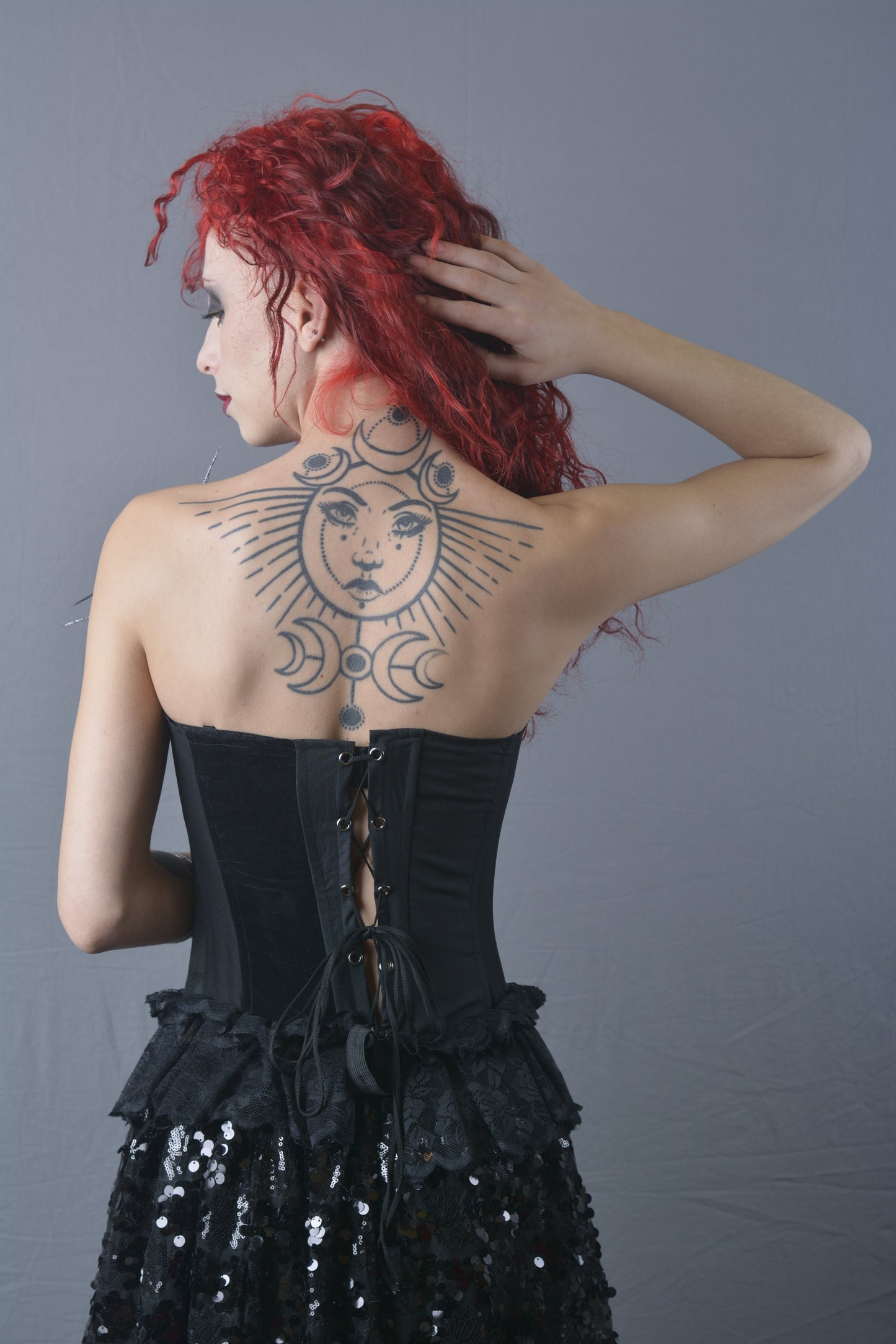 Aggiungi un tocco di eleganza e originalità al tuo guardaroba con questo bustino patchwork, realizzato con una varietà di tessuti neri. Decorato con rouche di organza sul davanti, una rosa in raso e piume, questo capo è un vero e proprio gioiello di stile. La stringatura sul retro garantisce una vestibilità perfetta e confortevole, rendendolo ideale per ogni occasione speciale. Ogni dettaglio è stato curato per offrirti un look unico e raffinato.